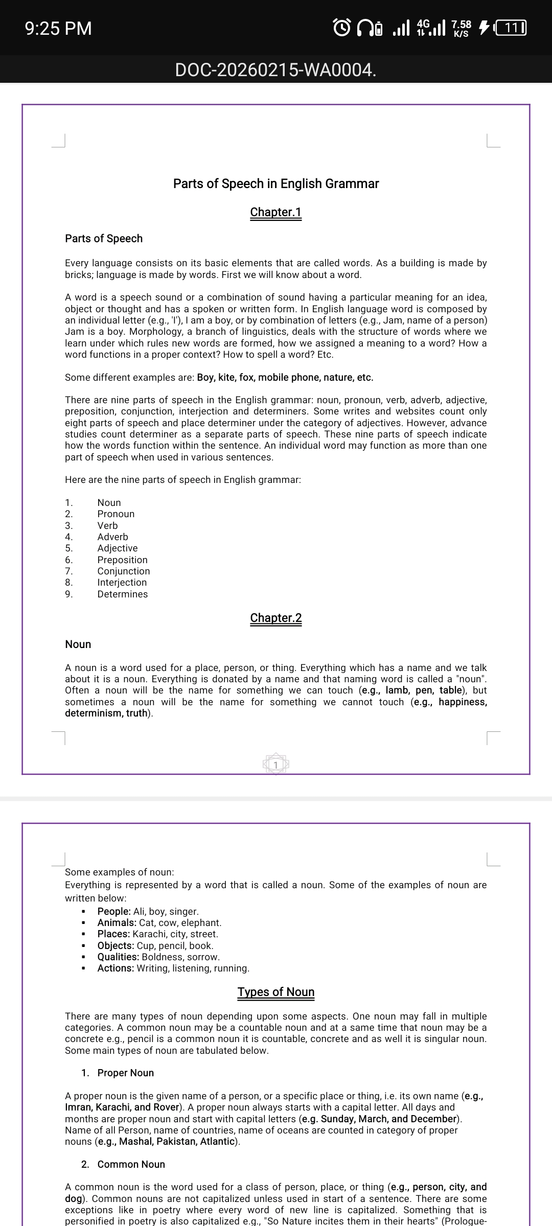 Parts of speech are the categories of words based on their function in a sentence. 1?? Noun ? What is a noun? A noun is the name of a: Person Place Thing Idea ? Examples: Person: teacher, John Place: Nigeria, school Thing: phone, table Idea: love, freedom, success ? Types of nouns: Common noun – city, girl Proper noun – Lagos, Mary Concrete noun – chair (you can see it) Abstract noun – happiness (you cannot see it) Countable noun – book/books Uncountable noun – water, advice 2?? Pronoun ? What is a pronoun? A pronoun replaces a noun. ? Examples: John is tired. ? He is tired. The students finished their work. ? Types: Personal: I, you, he, she, it, we, they Possessive: mine, yours, theirs Reflexive: myself, herself Demonstrative: this, that, these, those Relative: who, which, that 3?? Verb ? What is a verb? A verb shows: Action State Condition ? Examples: Action: run, eat, write State: be, seem Condition: have, own ? Types: Main verbs: speak, drive Auxiliary verbs: be, have, do Modal verbs: can, should, must 4?? Adjective ? What is an adjective? An adjective describes a noun. ? Examples: A beautiful house A difficult exam Three large boxes ? It answers: What kind? Which one? How many? 5?? Adverb ? What is an adverb? An adverb describes: A verb An adjective Another adverb ? Examples: She runs quickly. It is very expensive. He speaks extremely clearly. ? Many adverbs end in -ly, but not all. 6?? Preposition ? What is a preposition? A preposition shows: Position Time Direction Relationship ? Examples: The book is on the table. We met in July. She walked into the room. Common prepositions: in, on, at, for, of, to, with, by, from 7?? Conjunction ? What is a conjunction? A conjunction connects words, phrases, or clauses. ? Coordinating conjunctions: and but or so yet for nor Example: I wanted to go, but I was tired. ? Subordinating conjunctions: because although while if when Example: I stayed home because it was raining. 8?? Interjection ? What is an interjection? An interjection shows strong emotion. ? Examples: Wow! Oh no! Ouch! Amazing! They are often followed by an exclamation mark.